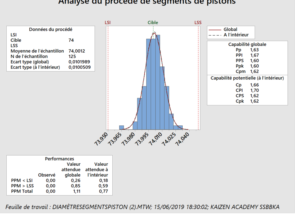 Un fabricant de moteurs utilise un procédé de forgeage pour fabriquer des segments de pistons. Les ingénieurs qualité veulent évaluer la capabilité du procédé. Ils collectent 25 sous-groupes de cinq segments de pistons et en mesurent le diamètre. Les limites de spécification pour le diamètre d’un segment sont 74,0 mm ± 0,05 mm.